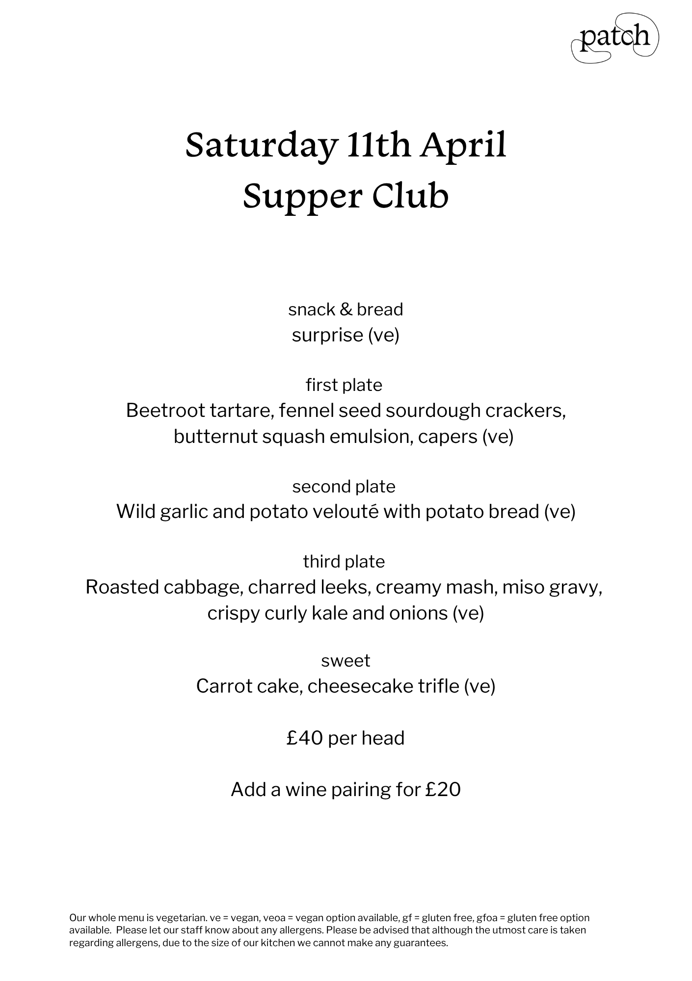 Just to let you know dinner at patch is no longer running. We are now running monthly supper clubs.